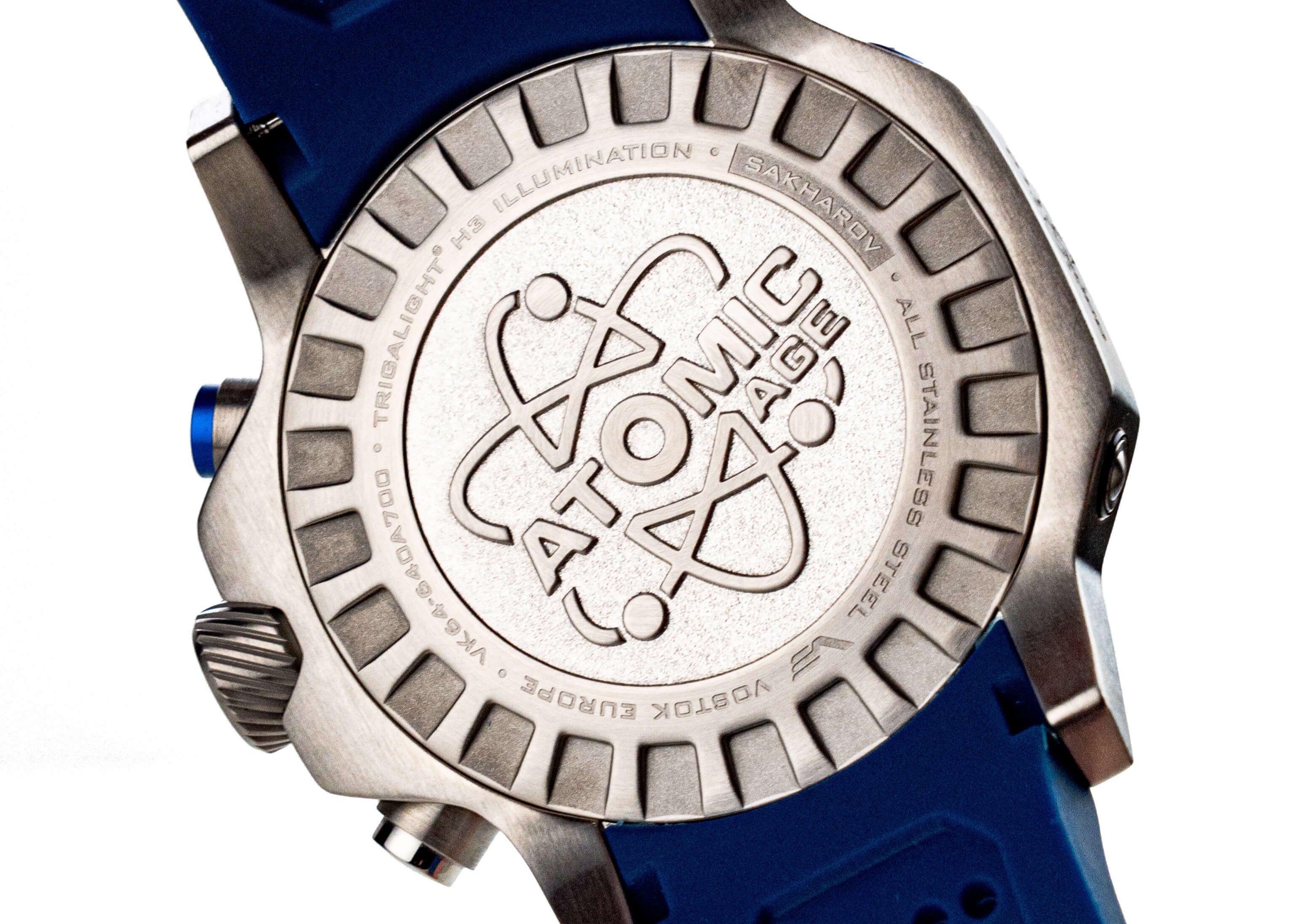 - The solid case back is decorated with a 3D engraving of the Atomic Age Collection logo.
