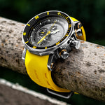 The case is also equipped with an automatic helium release valve, a spring-loaded one-way system that activates when critical pressure differentials occur — making the watch an ideal companion for professional deep-sea divers operating in mixed-gas environments.