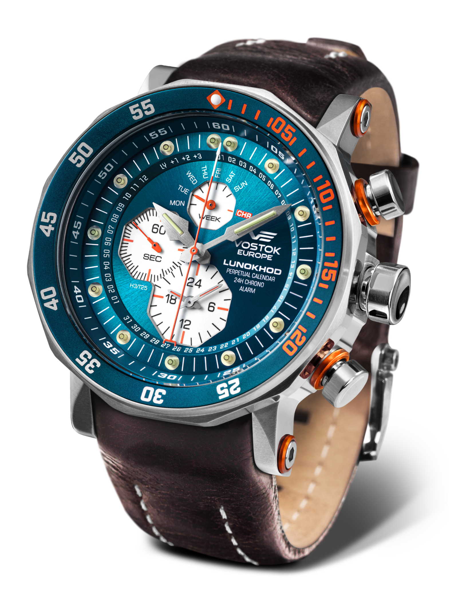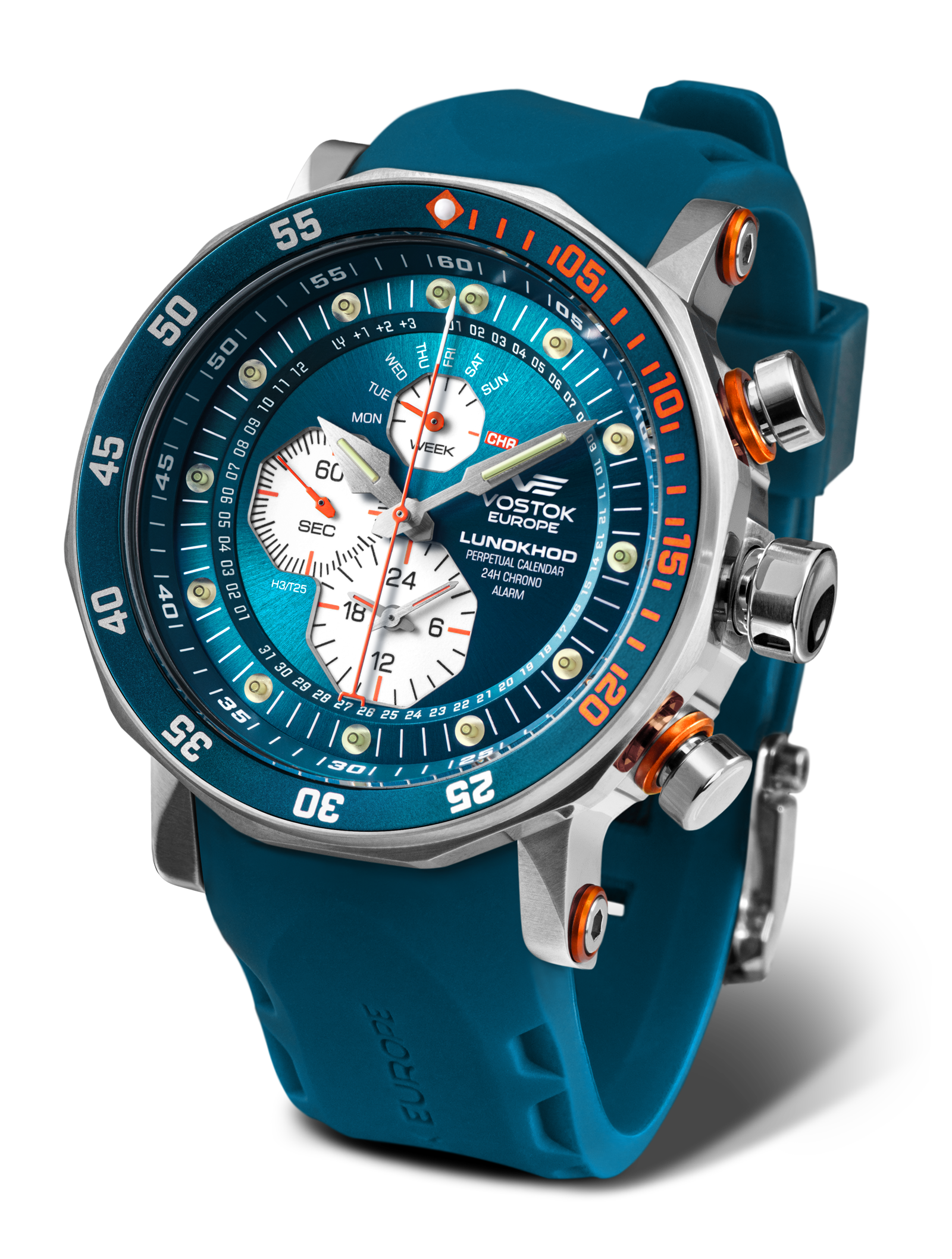 - Functions: Hours, minutes, seconds, day indication, perpetual calendar,sound alarm, central seconda hand 24H chronograph