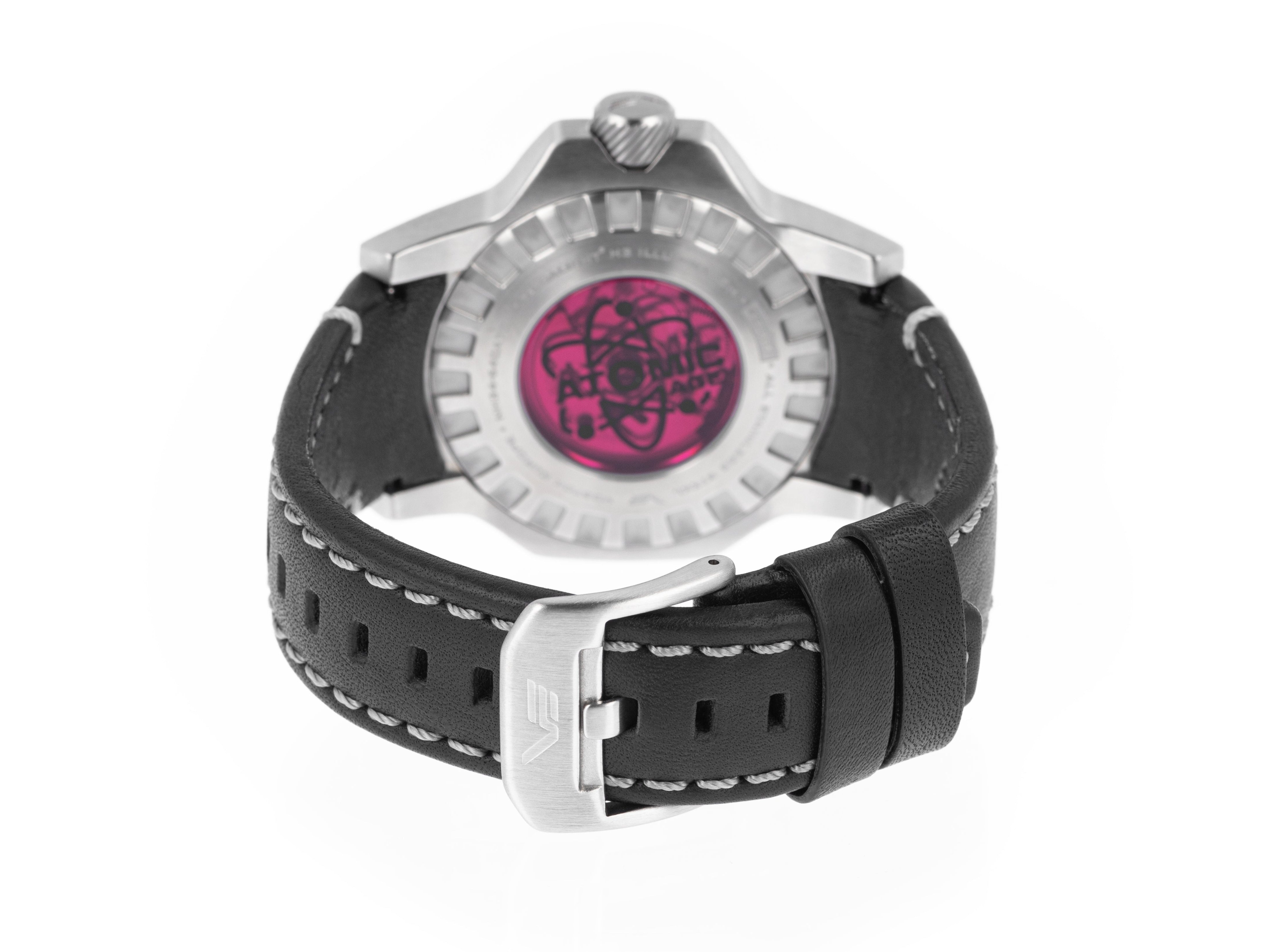- The dial features a distinctive grain texture, adorned with polished metal indexes and vertically mounted tritium tubes that provide outstanding, long-lasting illumination — adding a touch of "Atomic Power" to the overall design.
