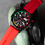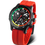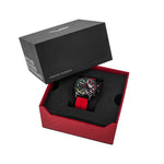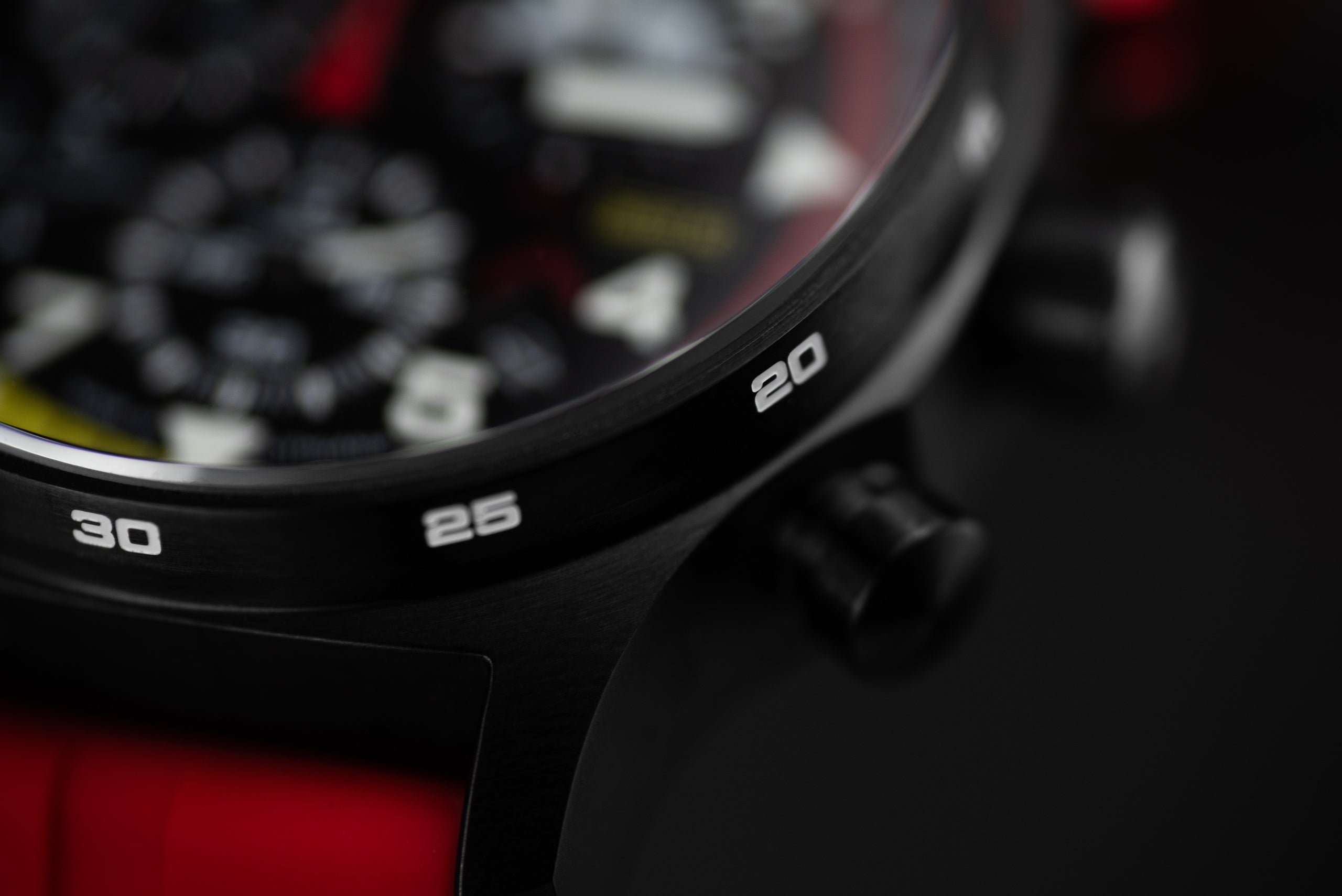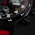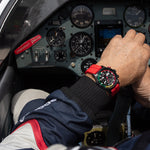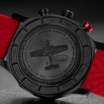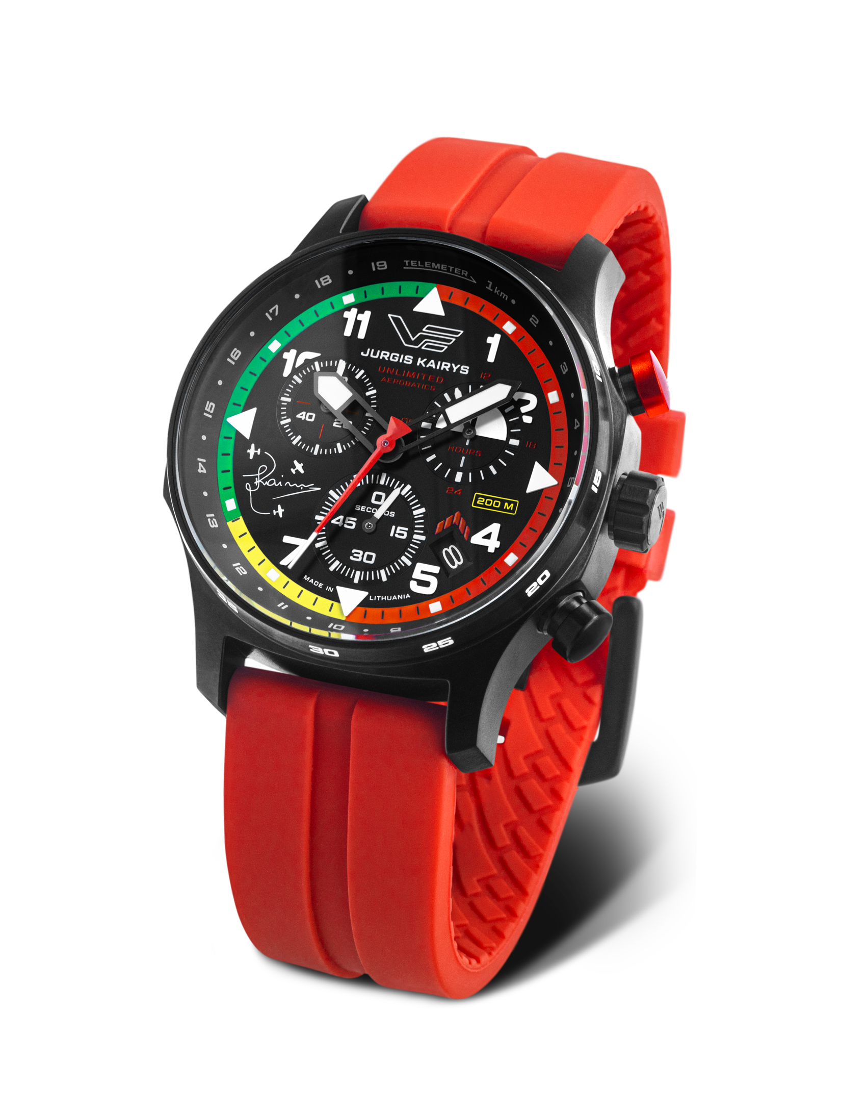 This timepiece has a robust 43 mm black PVD-coated case, water resistant to 20 BAR, and paired with a vibrant red silicone strap that reflects Jurgis’s bold aerobatic energy.